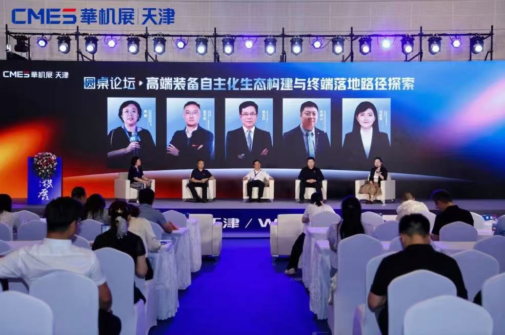 大会下午主要邀请企业负责人讲解高端装备国产化的实际应用实践。联想集团联想天津工厂智能制造负责人赵天铨、华中数控董事长陈吉红、科德数控股份有限公司副总经理宋明山、通用技术集团机床工程研究院有限公司正高级工程师郭兴龙、百度在线网络技术(北京)有限公司百度营销B2B行业运营总监张明远上台讲解。同时也邀请了部分嘉宾进行了以高端装备自主化生态构建与终端落地路径探索为主题的圆桌论坛。